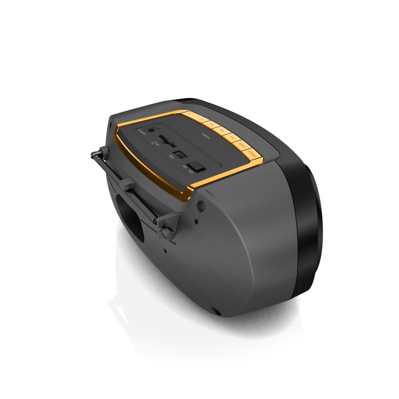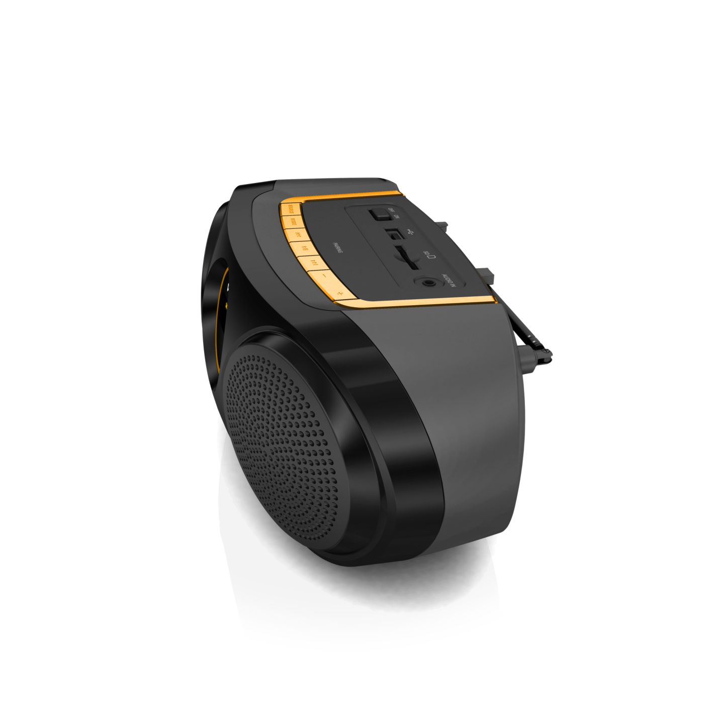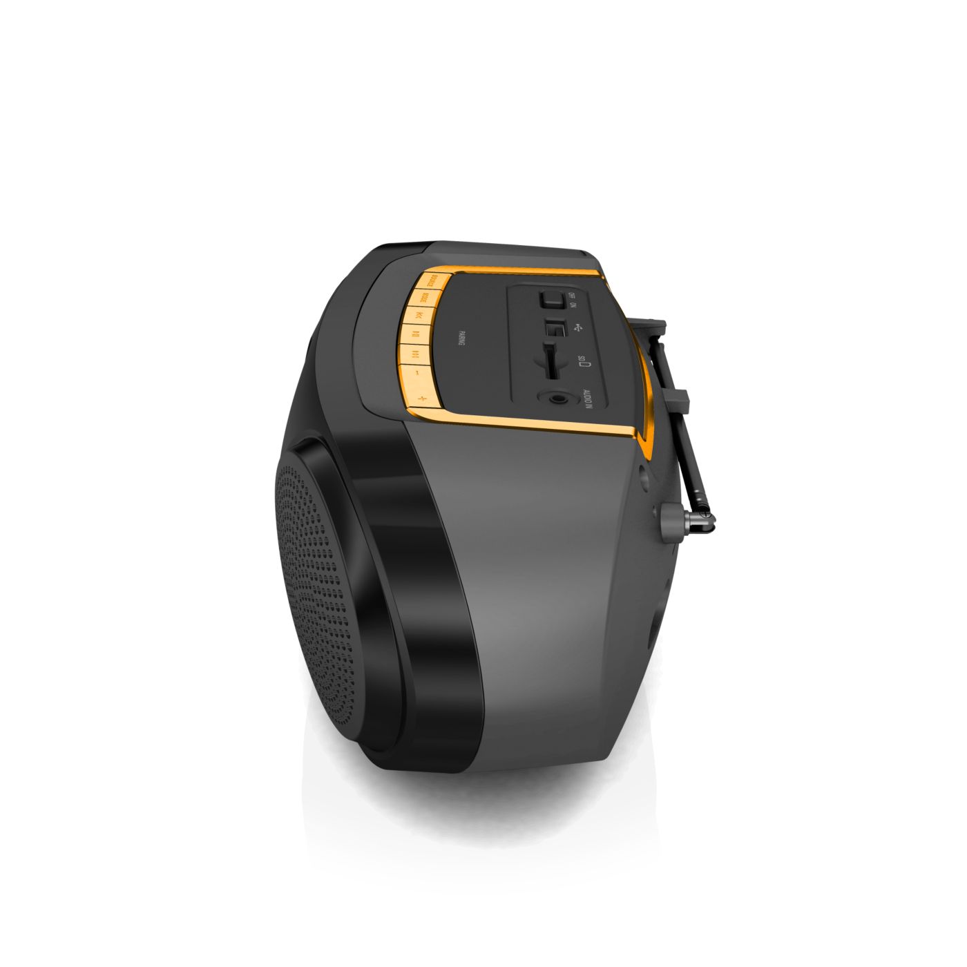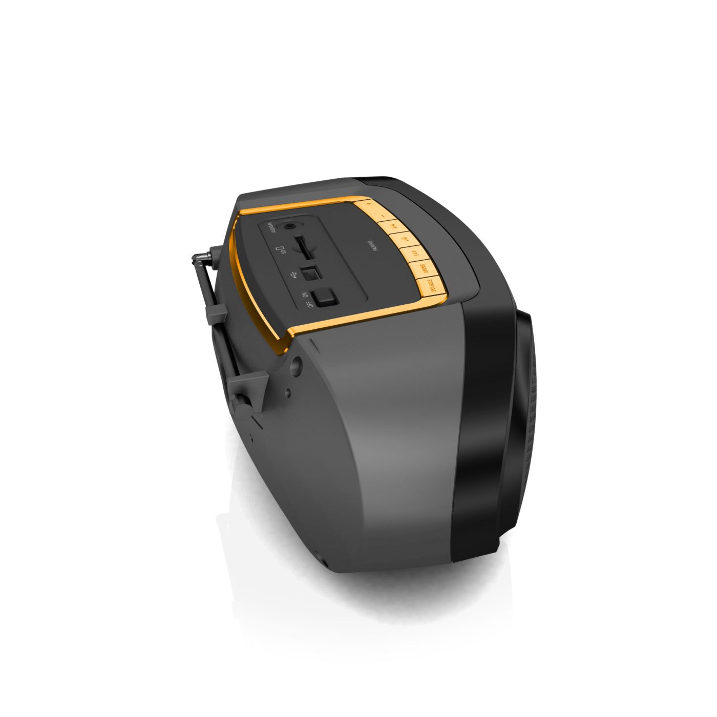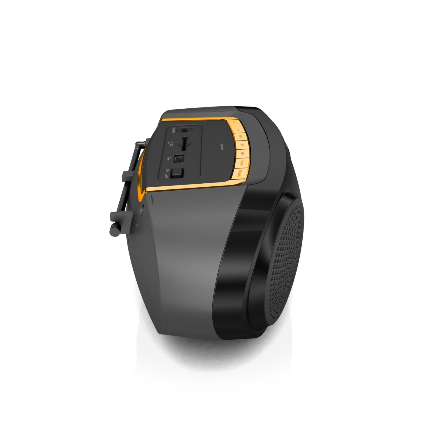 Produkt wizualnie jak i muzycznie super. Dźwięk i głośność wystarczająca. Wbudowany wyświetlacz, akumulator oraz antena. Sterowanie proste i intuicyjne. Brak rączki do przenoszenia.